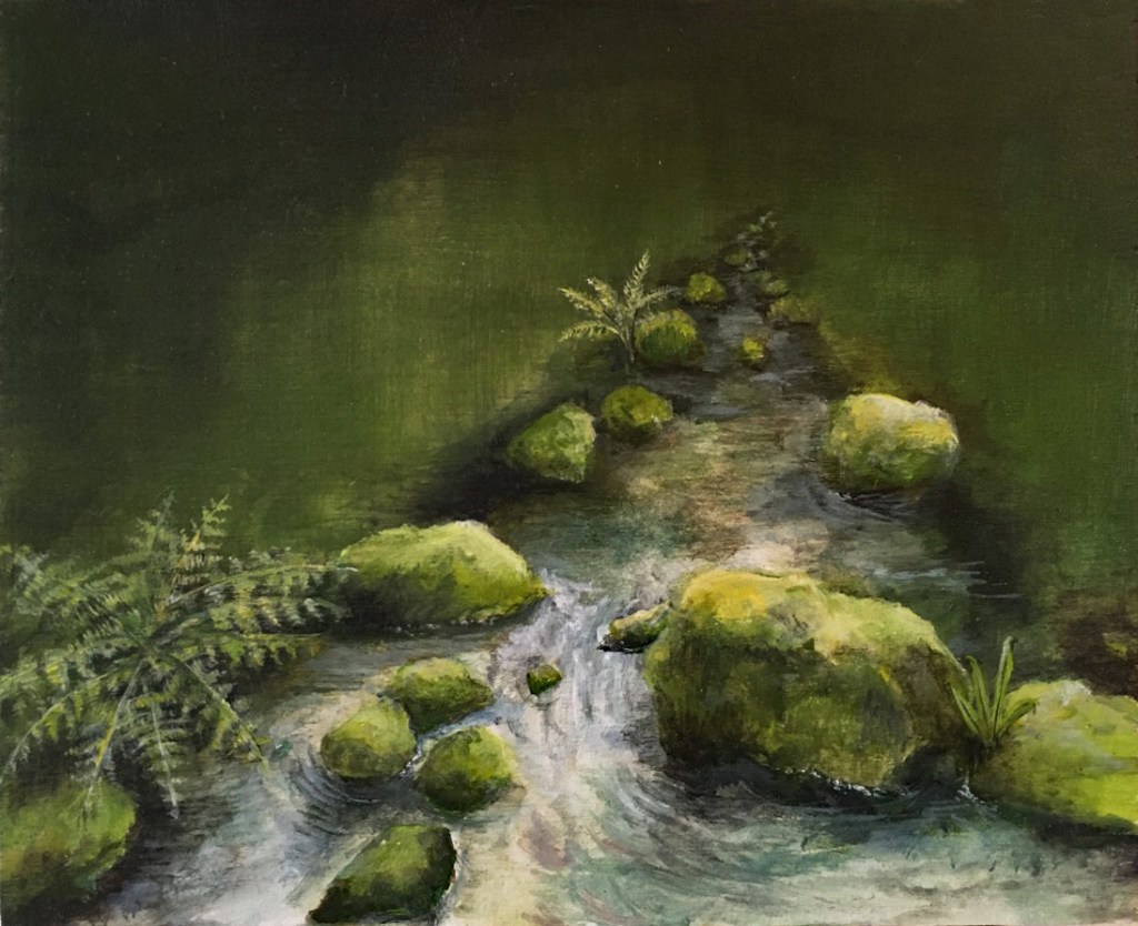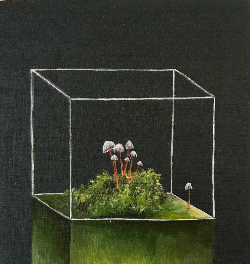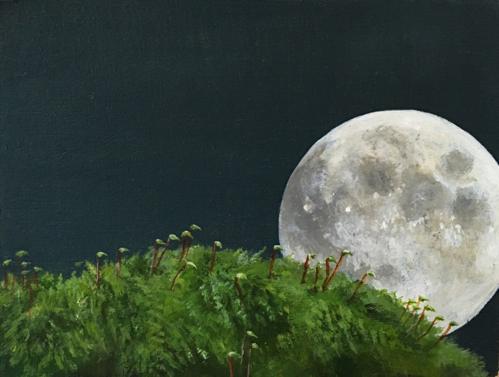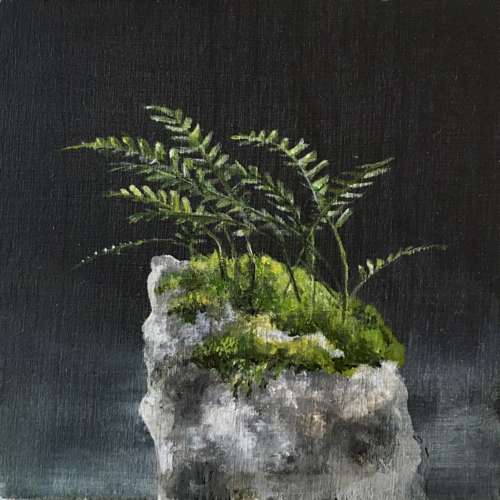 These paintings are part of a collaborative project with poet and friend Penny Boxall. The paintings run alongside Penny’s poems, which are inspired by the Victorian botanist and plant hunter Richard Spruce. His obsession with moss led him to intrepid explorations in the Amazon rainforest where he met with amazing natural phenomenons, unknown indigenous tribes, illness, loneliness and a plethora of beautiful mosses. All paintings are acrylic on board and no more than 12cm x 12cm in size.
