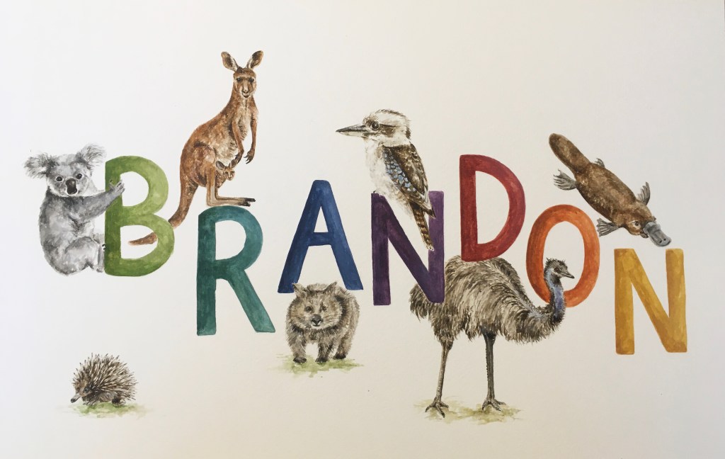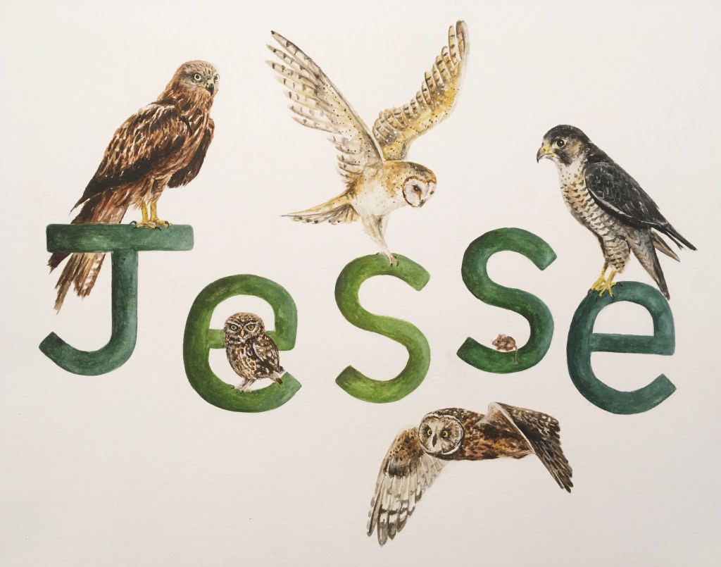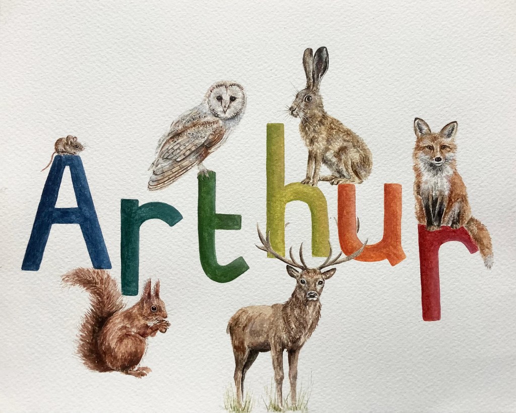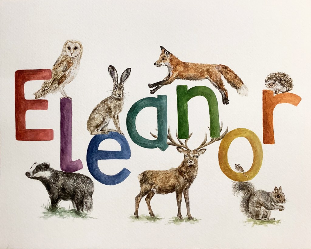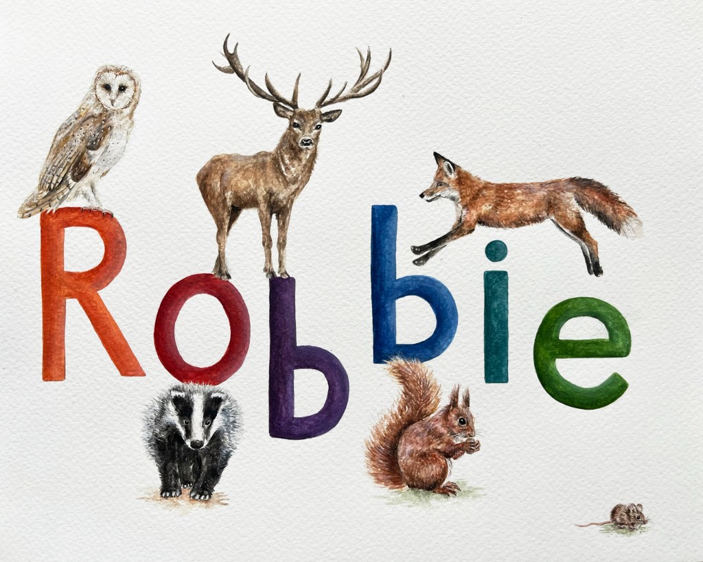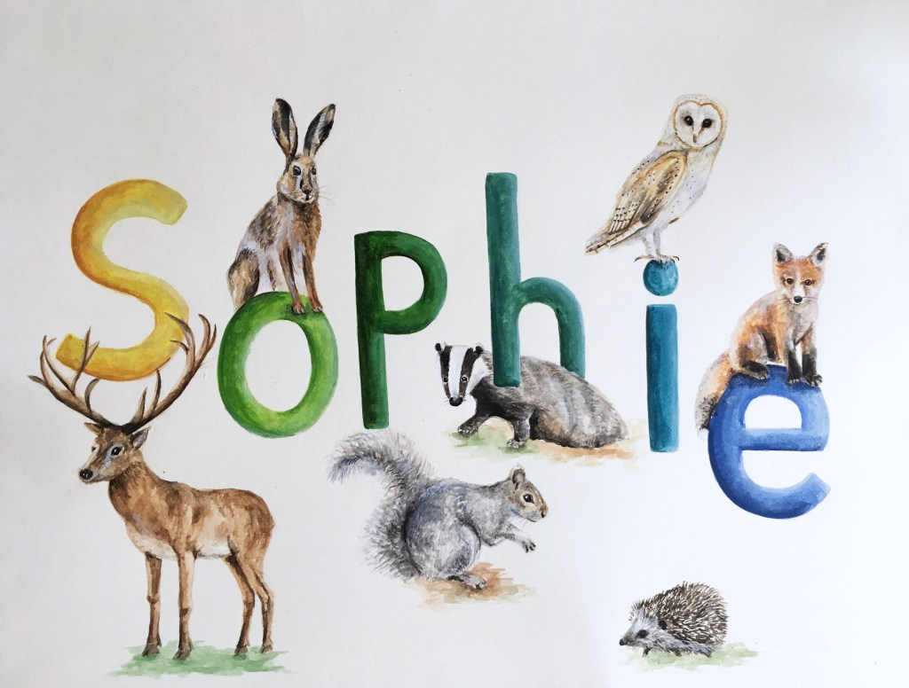 I can take on (just a few!) commissions for name paintings each year. Please contact me for details and prices. I’m happy to tackle any wildlife based theme, and can also paint individual letters or initials.