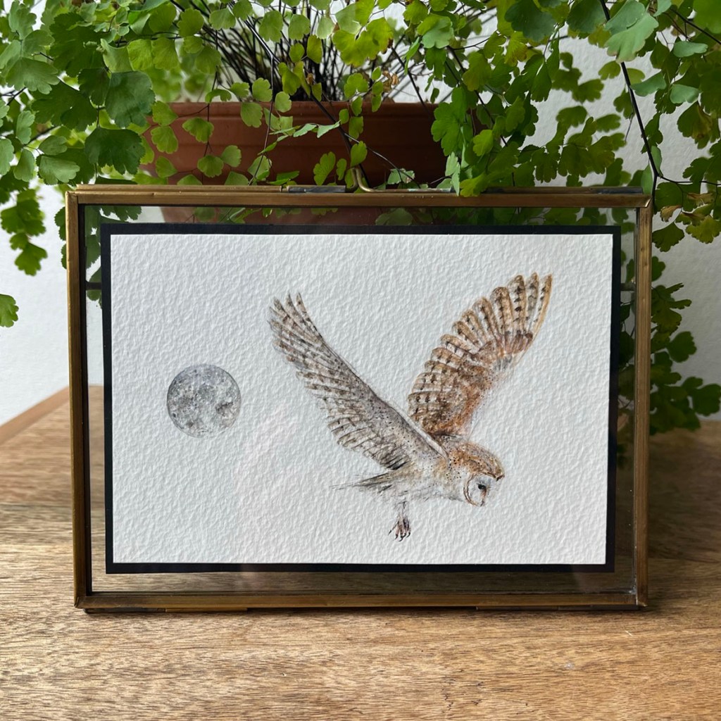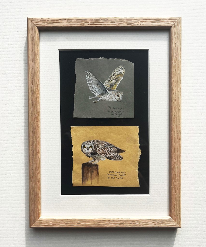 Barn Owls: These double sided glass frames are free-standing, with a foldable metal stand attached at the back. There is a special price of £75 if buying the two owls together.